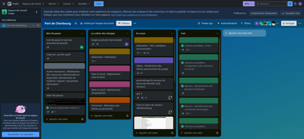 Grâce à Trello, nous avons pu nous organiser efficacement et répartir les tâches entre les membres de l’équipe. Pour ma part, j’ai été en charge du déploiement des serveurs web ainsi que de la configuration des routeurs.