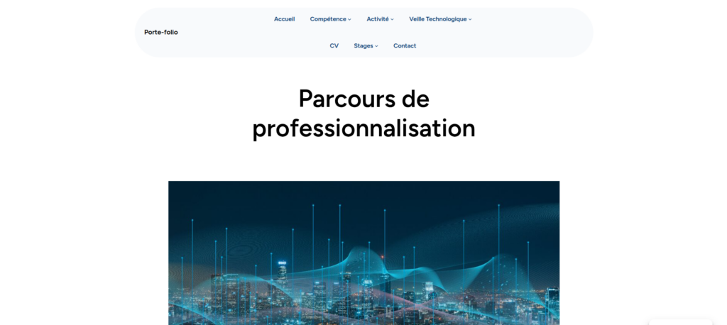 Cette première activité a consisté à concevoir un portfolio rassemblant mon CV, mes compétences, mes certifications, mes stages et mes futures activités de professionnalisation. Elle m’a permis de poser les bases de ma présentation professionnelle et de maîtriser les outils de mise en forme.